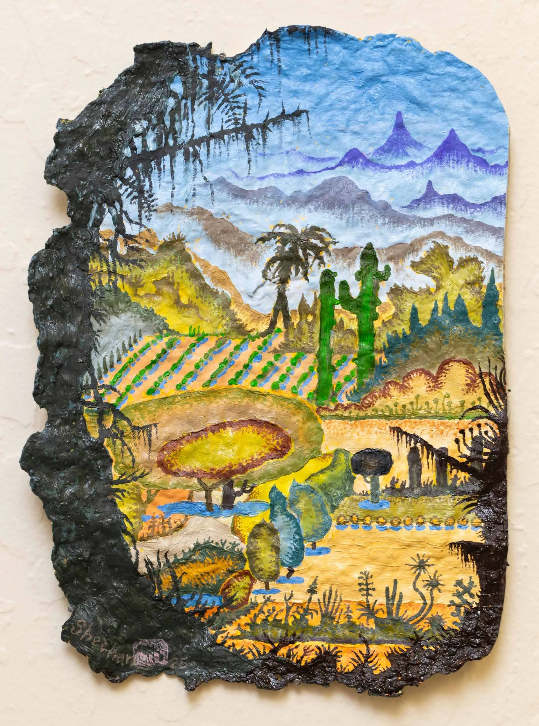 Sierra Azul 1. 2025, Oil, acrylic, gesso, and colored pencil on artist-made recycled paper panel. (11.5 x 8 in.)