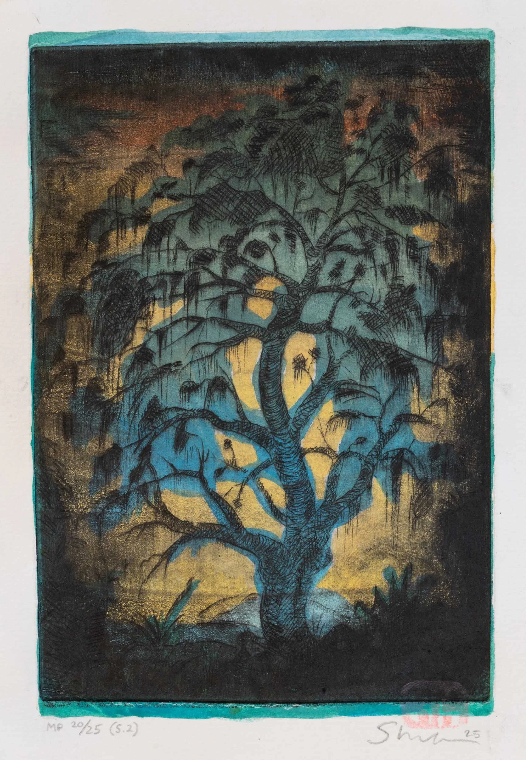 Live Oak (MP 17/25 s.2). 2025, Oil based drypoint monoprint over acrylic. (6 x 4 in.)
