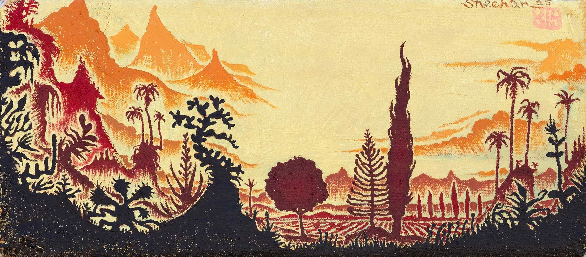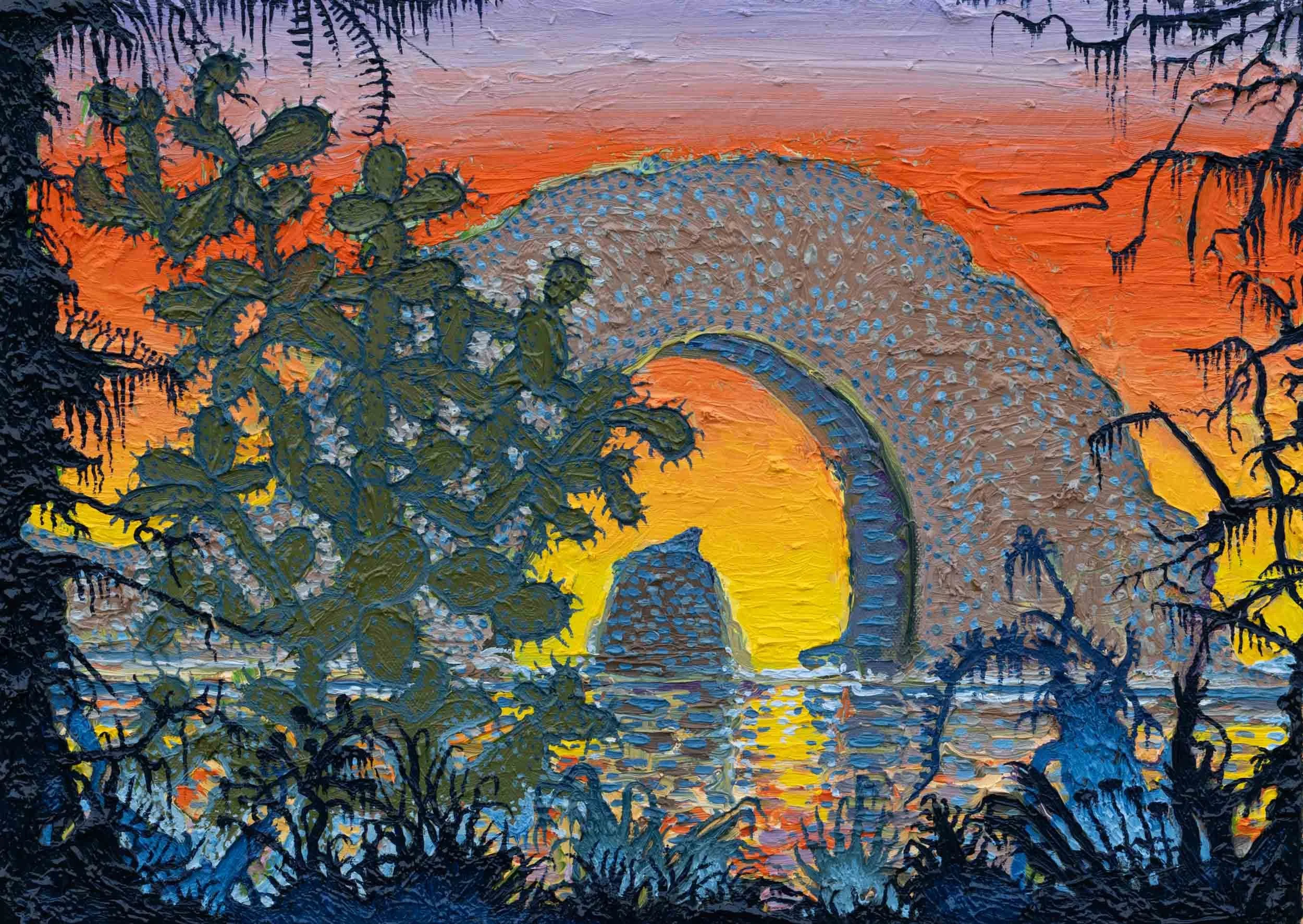 Revenge of Prickly's Gulch. 2025, Oil, acrylic, gesso, and colored pencils on canvas. (10 x 14.5 in.)
