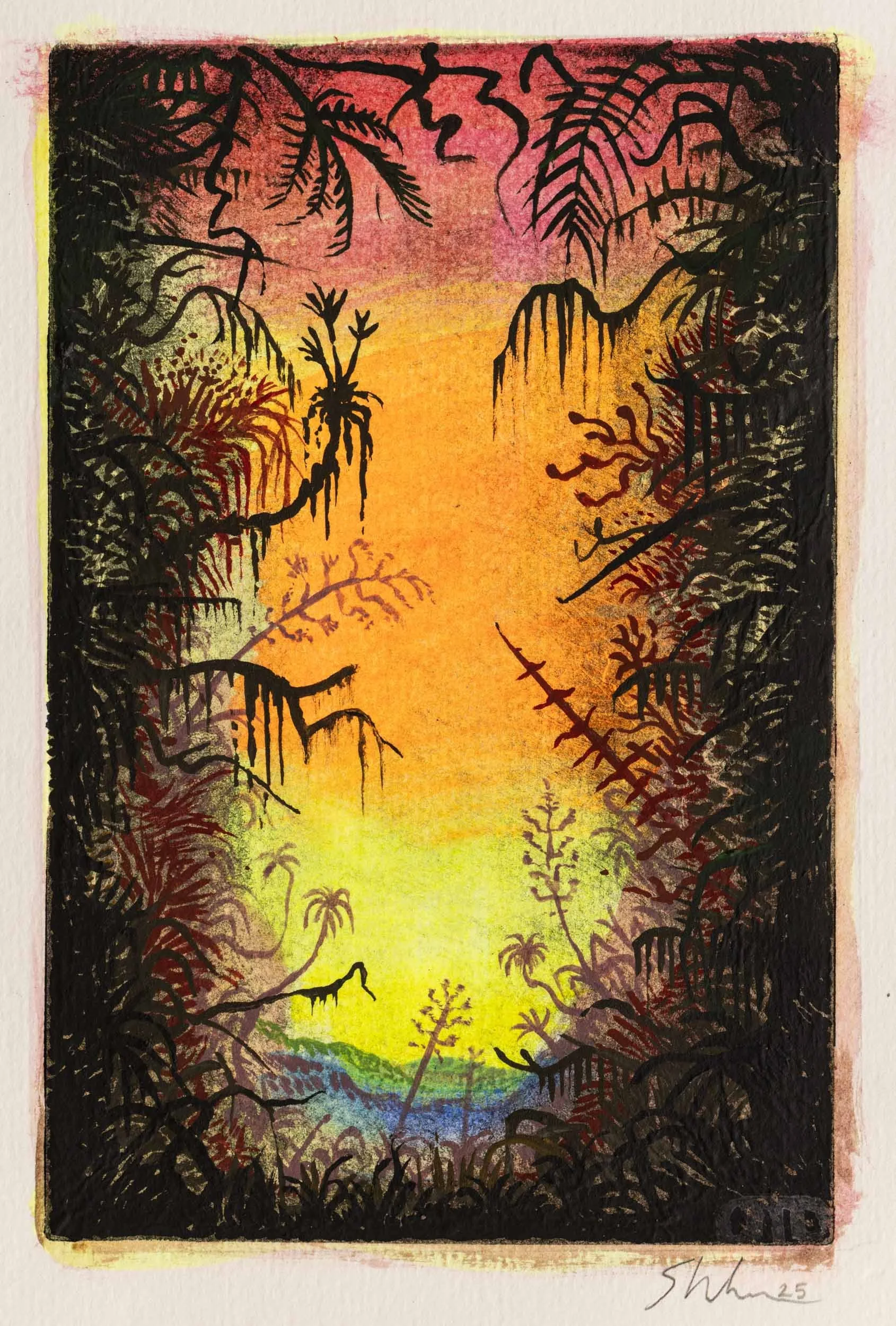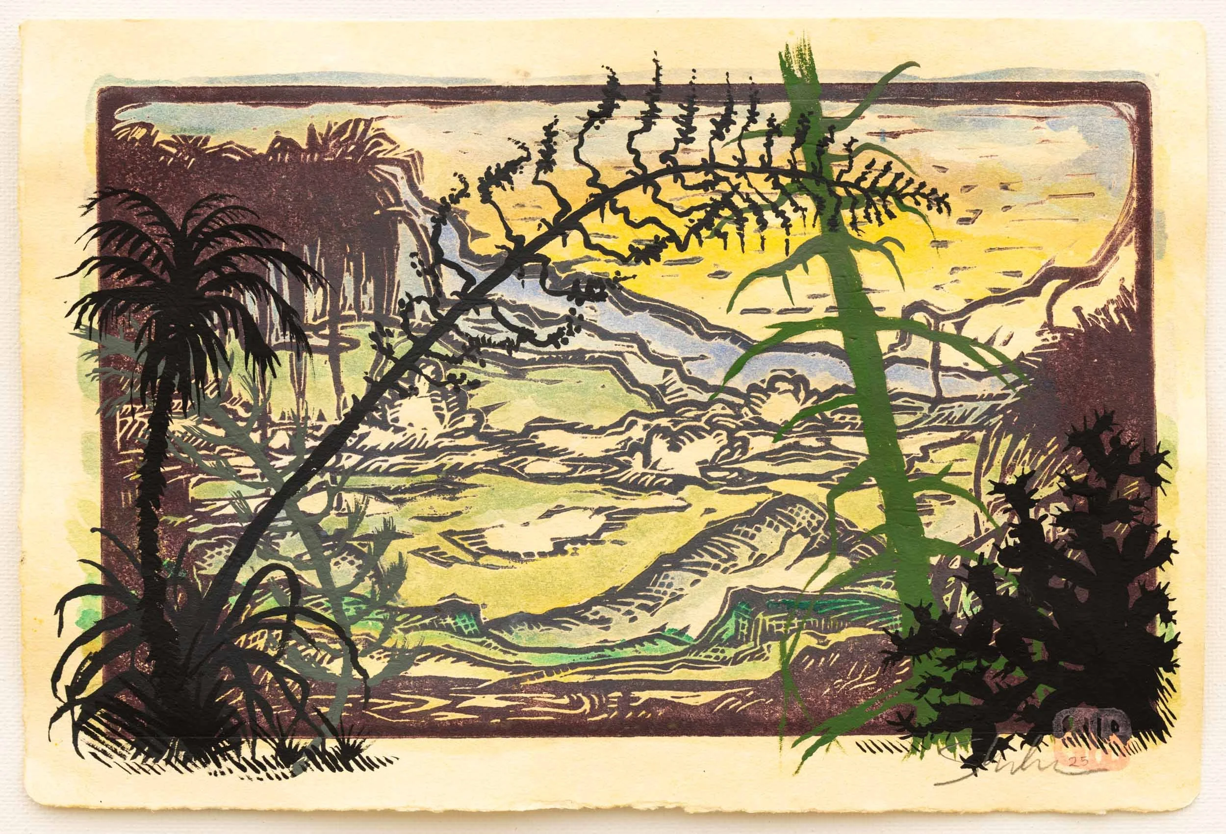 Hidden Valley Gorge (MP 4/10). 2024, Oil-based linoleum print over mono-printing and hand stenciling. (5 x 8 in.)