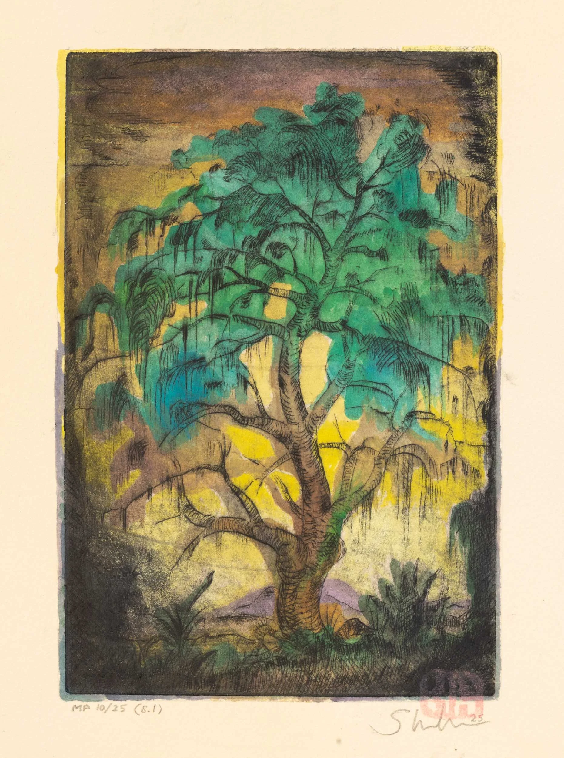 Live Oak (MP 10/25 s.1). 2025, Oil based drypoint monoprint over acrylic on tan paper. (6 x 4 in.)